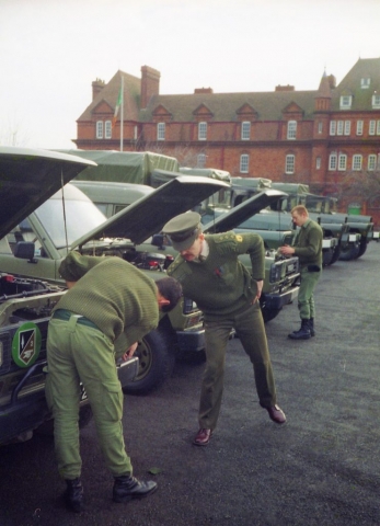 Photographs also show the Regiment preparing for an Eastern Command Transport Inspection in 1990 with Lieutenant-Colonel Mick MacAodhgáin and Captain Tom O’Callaghan, Transport Officer making a final pre inspectioncheck.