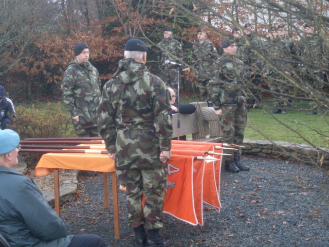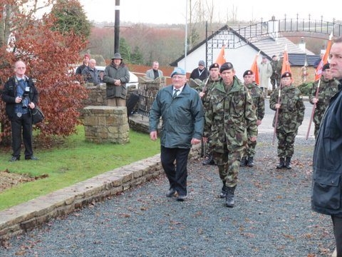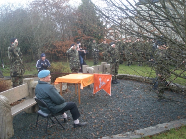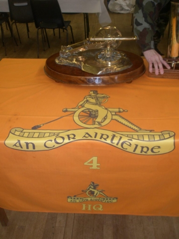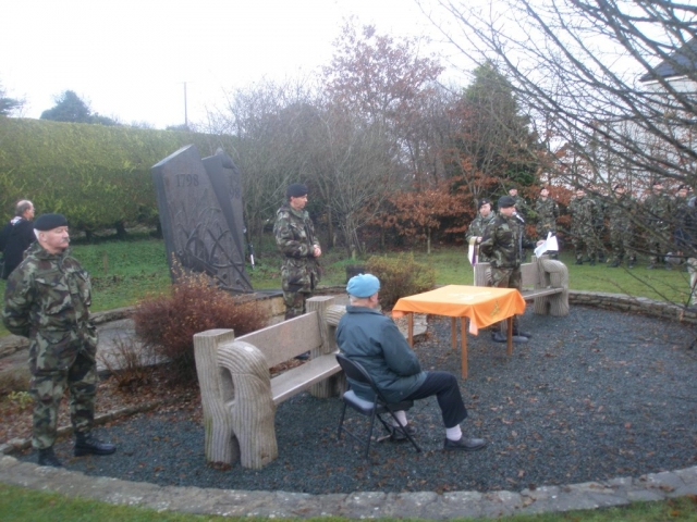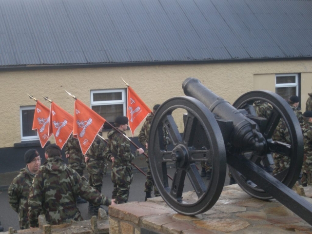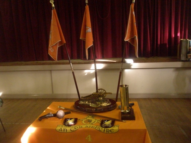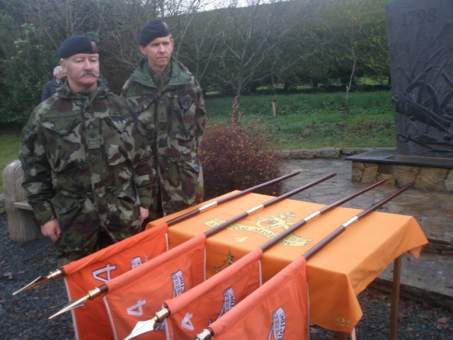 Under the command of Lieutenant-Colonel Ray Yorke, the 4 Fd Arty Regt, Columb Barracks, Mullingar, paraded its United Identification Pennants for the last time on Saint Barbara’s Day 2012 in Ballinamuck, the location of Gunner Magee’s last action in 1798. The Pennants final blessing was conducted by Rev Fr Bob McCabe. The Guest of Honour was Corporal Bobby Allen DSM. Regimental Sergeant-Major Noel O’Callaghan was the Chief Marshal. Former personnel of the Regiment were in attendance, including Brigadier-General Paul Pakenham (Retd) (President of the Artillery Club), Colonel Jim Prendergast (Retd) (Former Director of Artillery), and Commandant Padraic McDunphy.